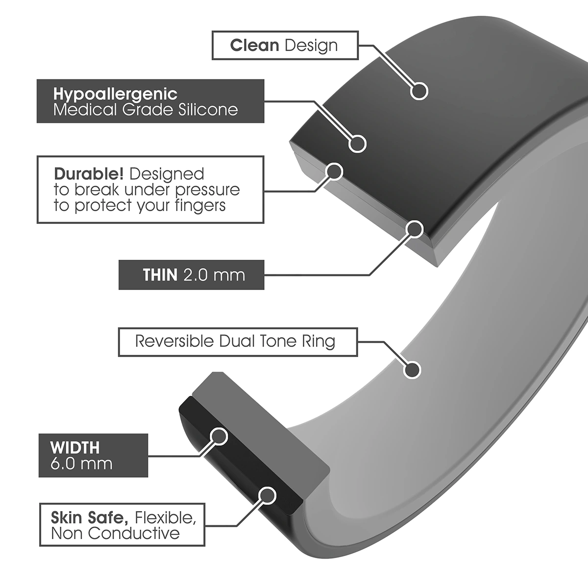 Our rings are built on the foundation of safety and durability. They're 100% non-toxic, hypoallergenic, and designed to withstand the challenges of your daily pursuits, whether you're hitting the gym, working with heavy machinery, or simply crafting. With our rings, you're not just making a statement – you're embracing a lifestyle that blends love, adventure, and resilience seamlessly. Choose quality, comfort, and style with our silicone wedding bands and let your love story shine in every moment of your life. If you are not sure about the sizes, see our RING SIZE CHART