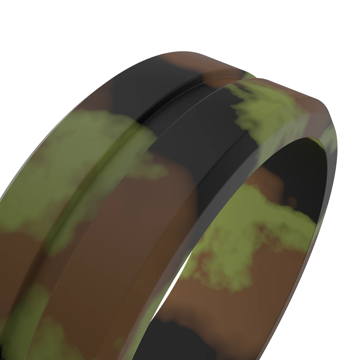 Embrace your adventurous spirit with our Camo Sport Men’s Wedding Band. This snap ring of silicone for comfortable wear features a unique blown camouflage pattern.