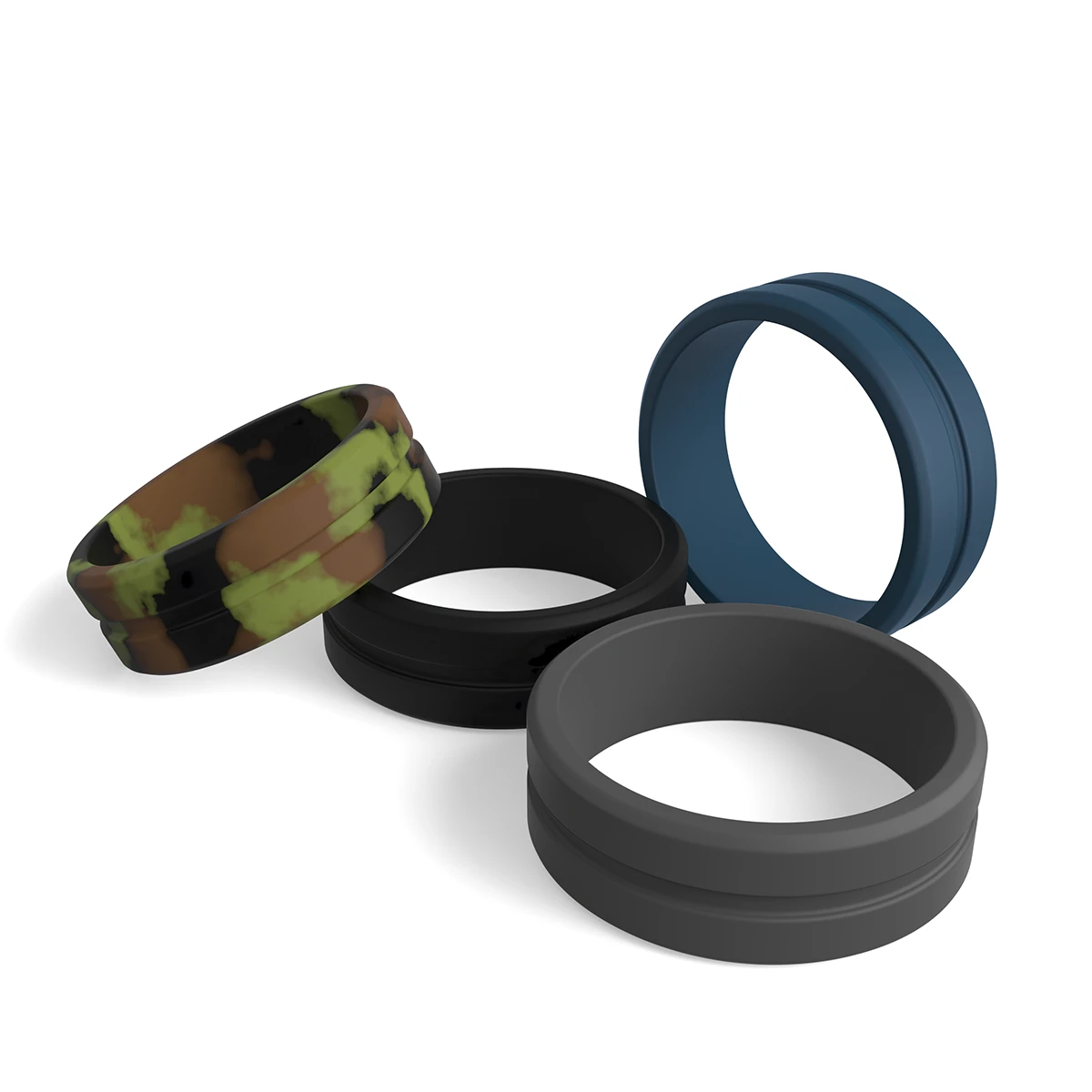 Get your adventure on in style with our Sport Men’s Wedding Band Silicone: Hunter Set of 4 Rings. This bundle includes a pack of four variously colored rings to match every one of your outdoor activities: black, blue, gray, and camo.