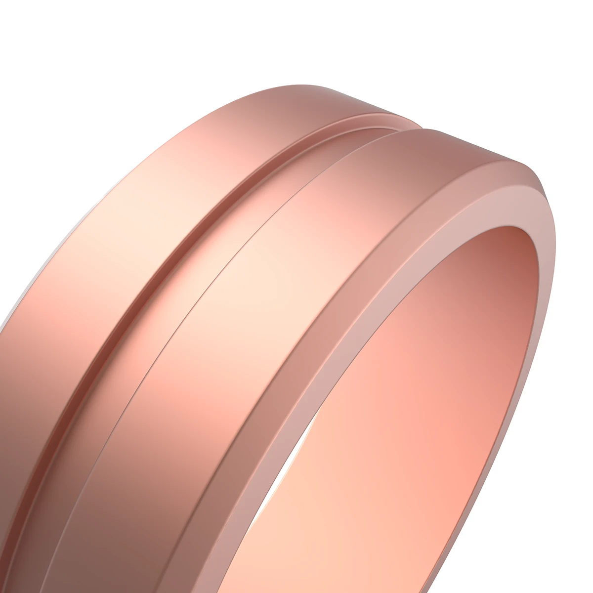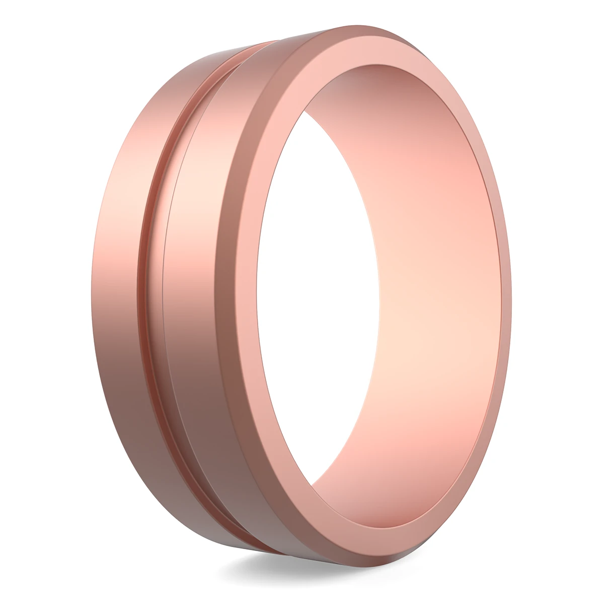 This rose gold silicone wedding band is a consummate mix of style and practicality. Built from comfort-fit silicone, it is sleekly designed with a millimeter width of 8.7 and a thickness of 2.7 millimeters. With tensile strength at 17 pounds, this ring is durable, non-conductive, and non-porous for any lifestyle.