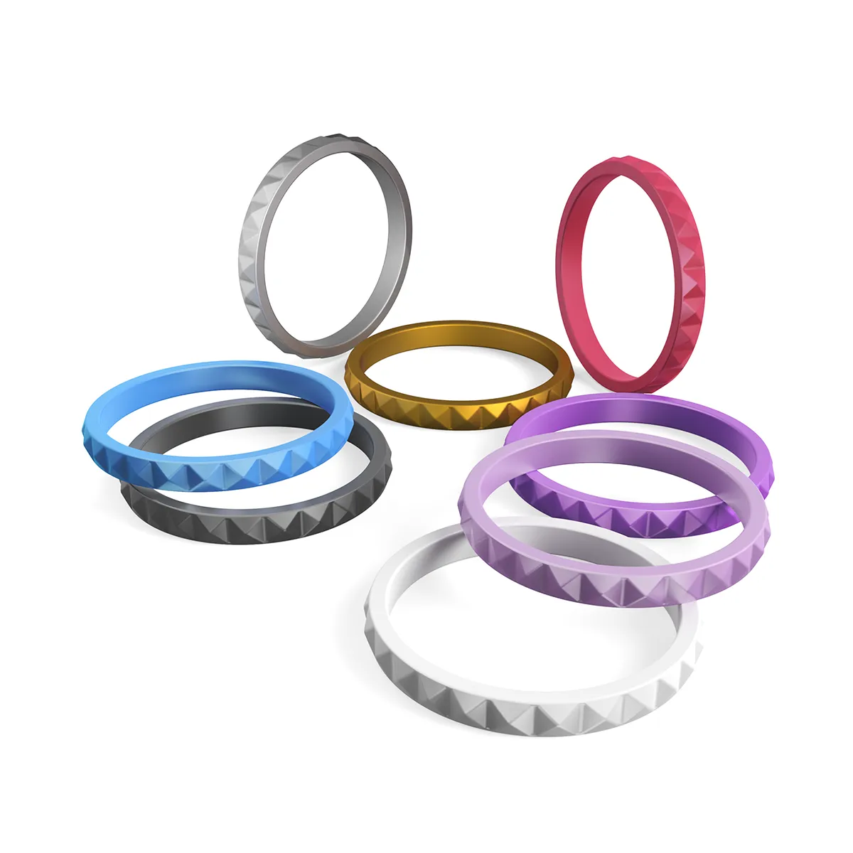 Get groovy with our Diamond Silicone Ring Women: Stackable Groovy Set of 8. This eight-pack of rings will give you a fashionable palette of colors to complement each and every style. From purple, violet, white, and silver to gold, blue, and grey, mix and match for a different look.